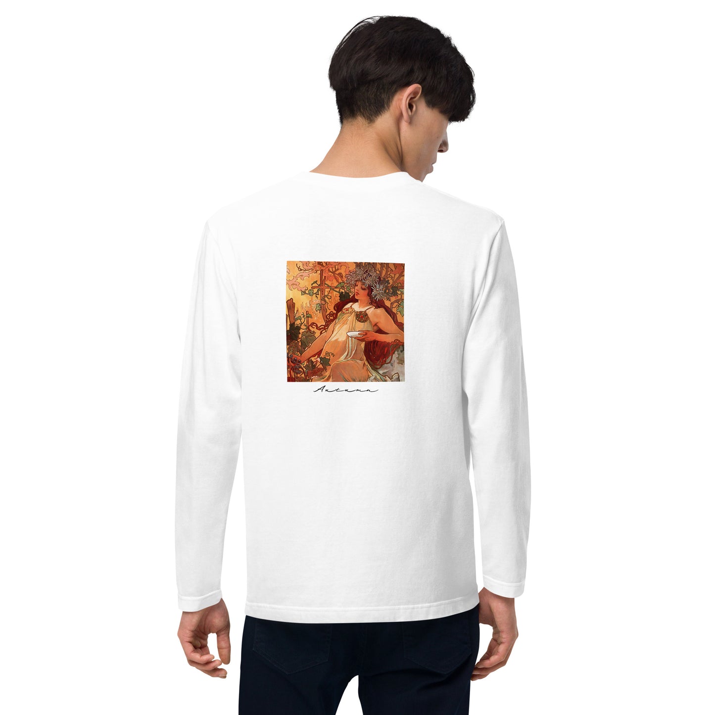 『秋』(作者:アルフォンス・ミュシャ)を背面にプリントした長袖Tシャツです。1896年にアルフォンス・ミュシャに描かれた作品です。こちらの商品はパブリックドメインの絵画を使用しています。